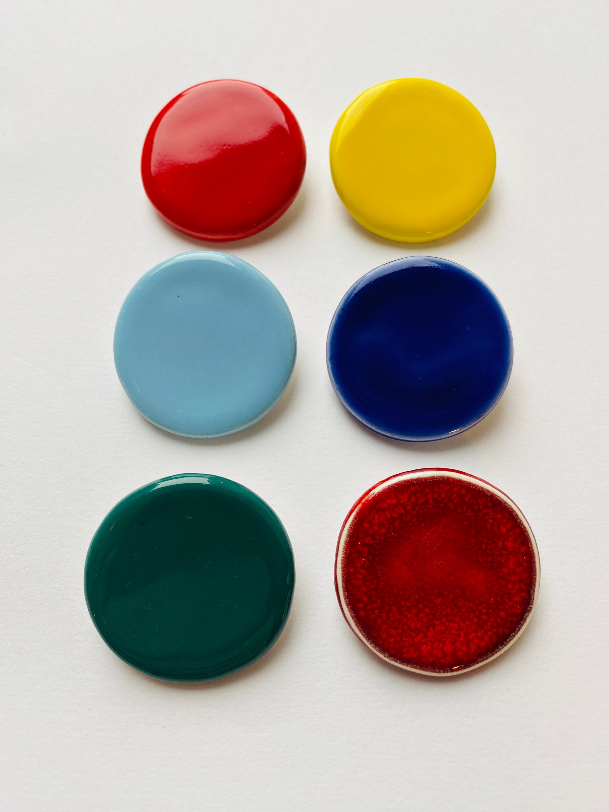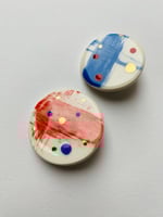 A bright pop of colour to grace any lapel, collar, hat or bag. You can group them together for impact or just have the subtlety of a small joyful slice of colour. There are also unique, hand drawn blobs that are individual designs made from dry brush, paper resist, and sgraffito