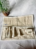 A simple porcelain Nativity set, with golden crowns and halos’ comprising of The Three Kings, The Virgin Mary, Joseph and Jesus in a manger. Each piece is hand sculpted and there are variations in size and design between the sets, each set is unique and the set comes with its own handmade protective bag with compartments for each of the pieces so that it can be stored safely each year.