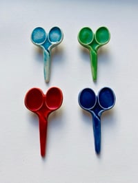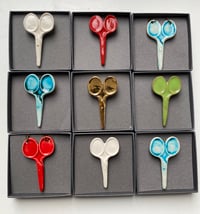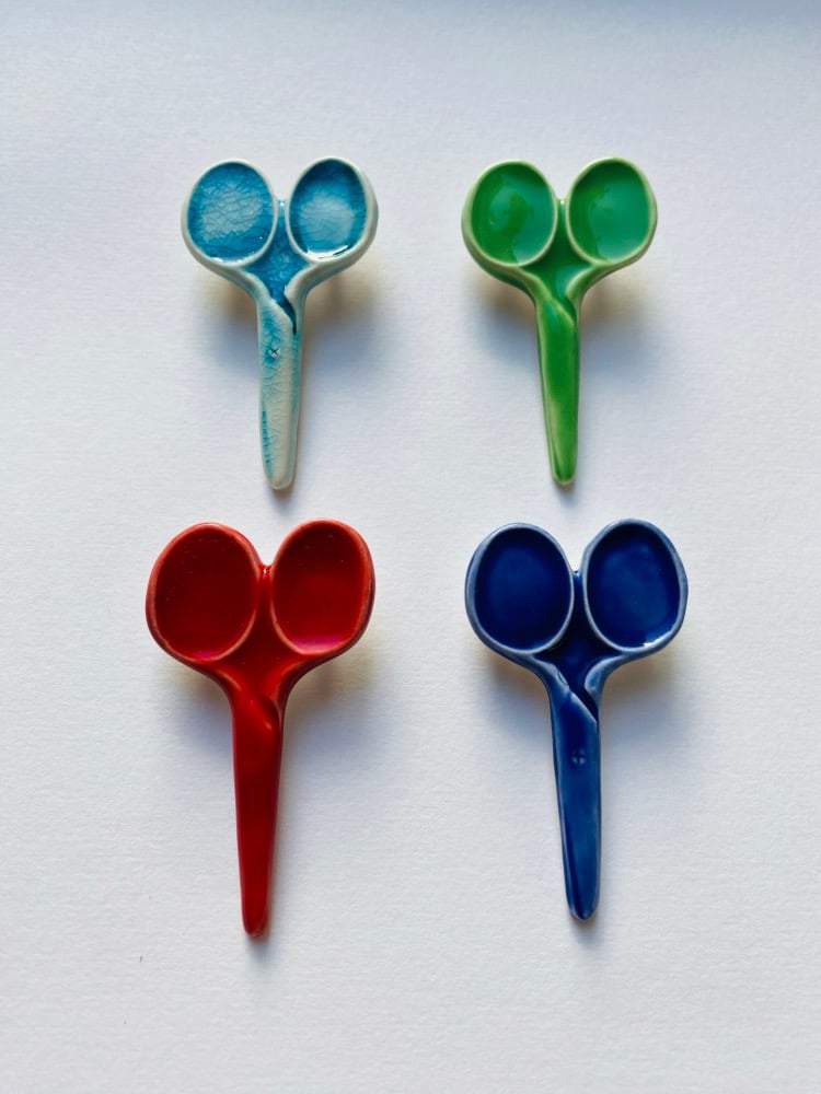 Press moulded and individually handcut scissors brooch and necklace. Each piece takes over 9 processes and two firings to arrive as these beautiful porcelain items. Perfect for dressmakers, knitters and hairdressers.